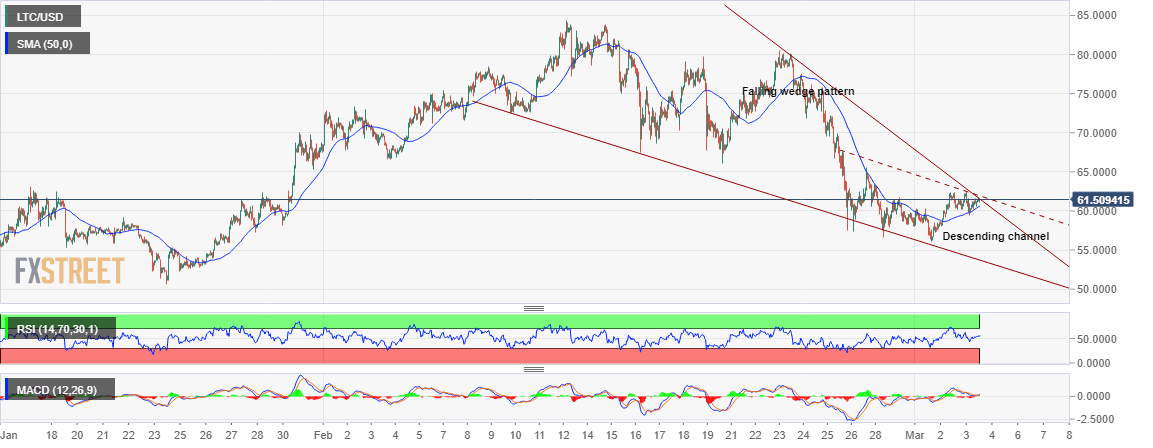 - Litecoin settles in a comfort zone between $60 and $62, lagging breakout above a falling wedge pattern.