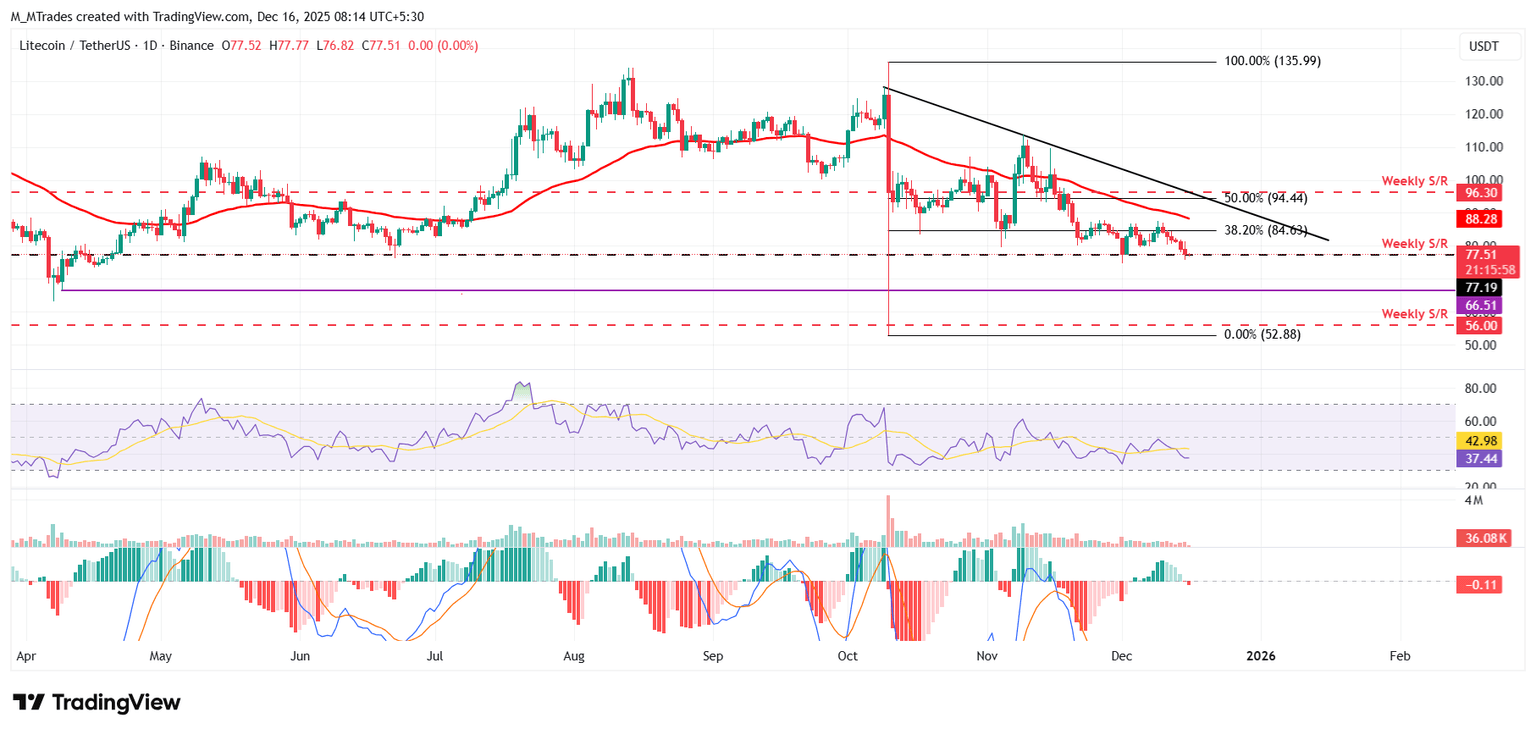 Litecoin (LTC) remains under heavy selling pressure, trading below $78 on Tuesday, extending its losing streak to seven consecutive days after being rejected at a key resistance zone. With social interest fading and momentum indicators turning increasingly bearish, downside risks remain dominant.