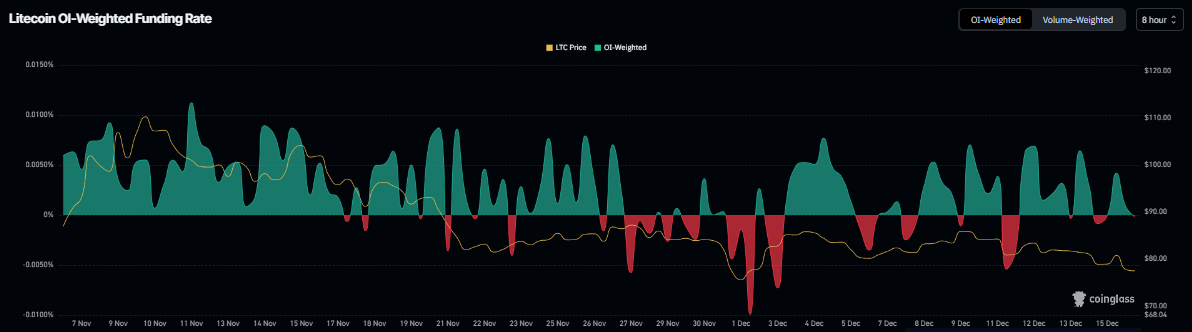 On the derivatives front, data further supports a negative outlook for Litecoin. Coinglass’s OI-Weighted Funding Rate data show that the number of traders betting that the price of LTC will slide further exceeds those anticipating a price increase.