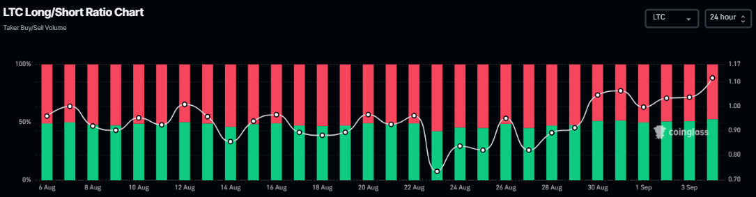 Coinglass’s long-to-short ratio of LTC further supports the bullish outlook. The ratio currently stands at 1.11, the highest level over a month, indicating traders are betting on the asset price to rally.