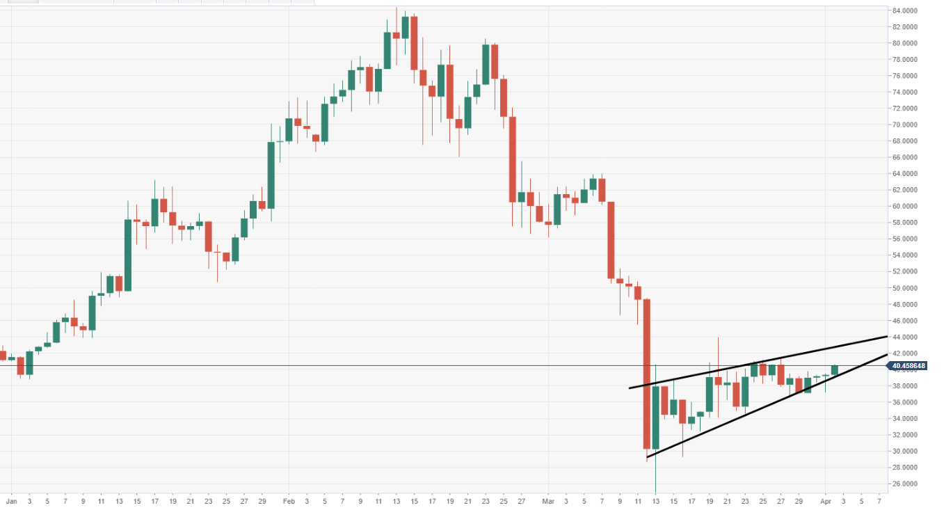 - The price continues to be limited to the upside by the barrier at the psychological $40 mark.