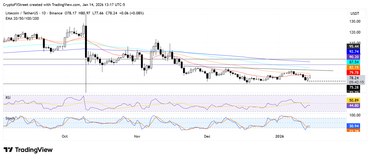 Litecoin is struggling on Wednesday to break above the 20-day and 50-day Exponential Moving Averages (EMAs) after finding support at $75. A firm rise above these EMAs could see LTC test a descending trendline resistance extending from November.