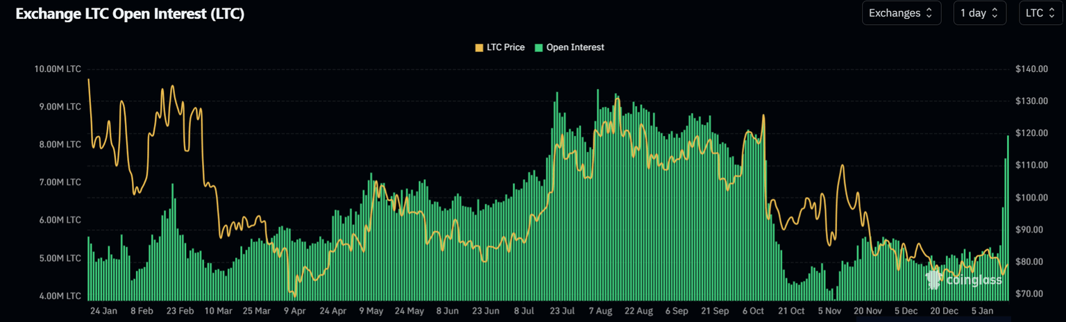 - Litecoin open interest also surged to 8.25 million LTC on Wednesday, its highest level since the October 10 leverage flush.