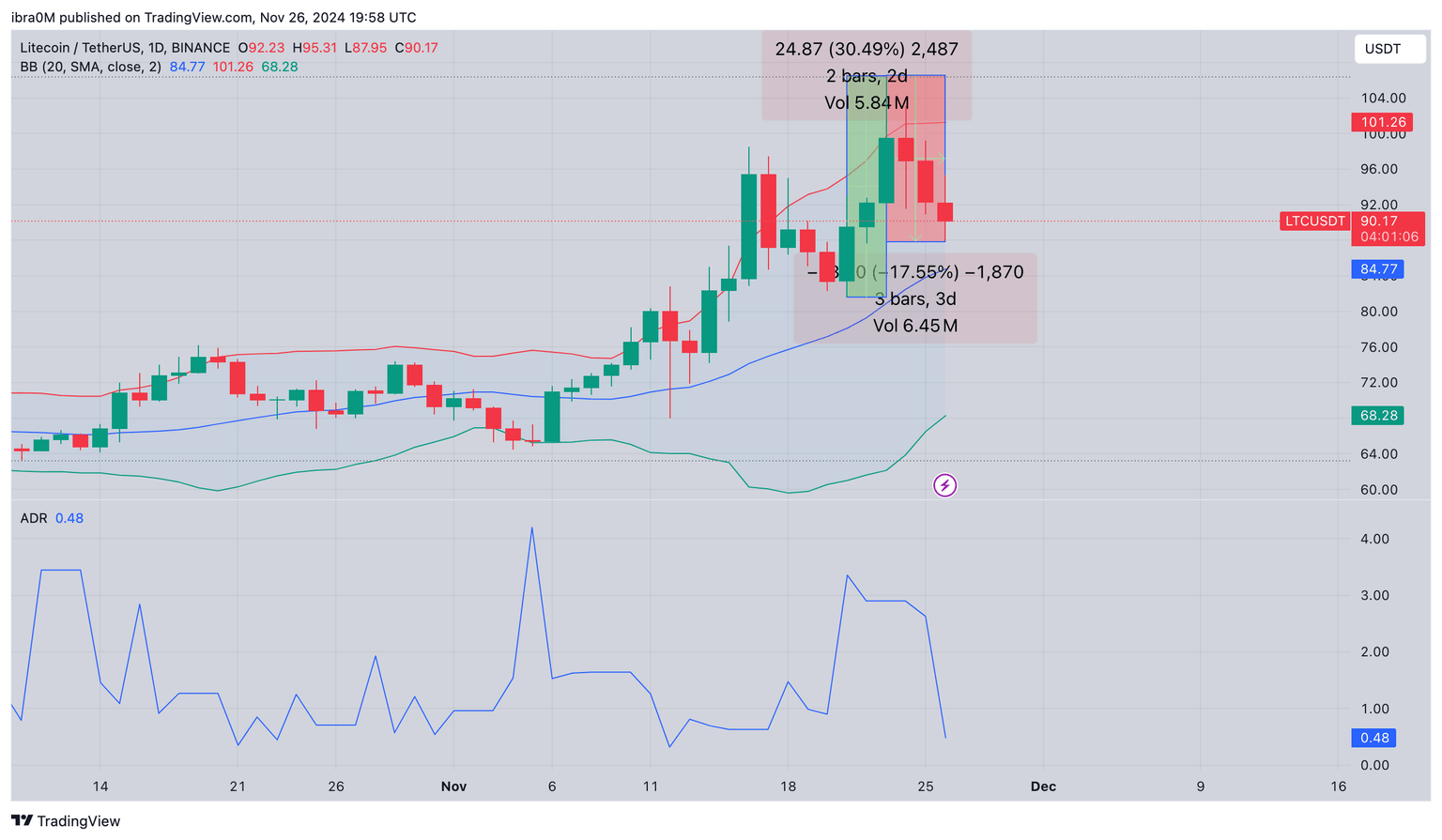 - Litecoin traded below $88 on Tuesday, a steep 17% decline from the November 23 high of $106.