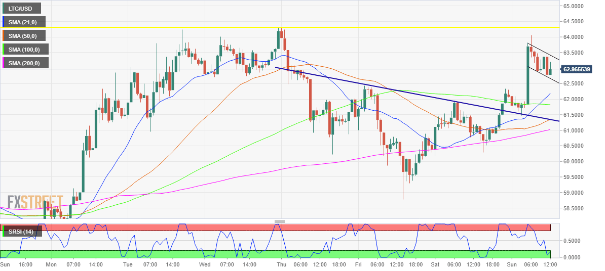 The sixth most widely traded cryptocurrency - Litecoin (LTC/USD), with a market capitalization of $ 4.02B, extends its bullish momentum for the second day in a row this Sunday. The coin is back on the 63 handle, having gathered pace above the 61.8% Fibonacci Retracement (Fib) of the latest decline for the renewed upside. The bulls now target the last week’s high at 64.32, rejoicing the resurgence of the weekend love for most digital currencies. At the press time, the price trade near 63.20, up 1.75% on the day and 3.20% over the last 24 hours.