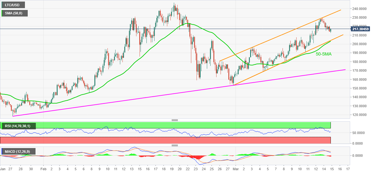 LTC/USD picks up bids near $218.00, up 1.82% intraday, during early Monday. In doing so, the cryptocurrency pair recovers from the lowest since Friday as RSI pullback from overbought territory catches a breather inside a three-week-old rising channel.