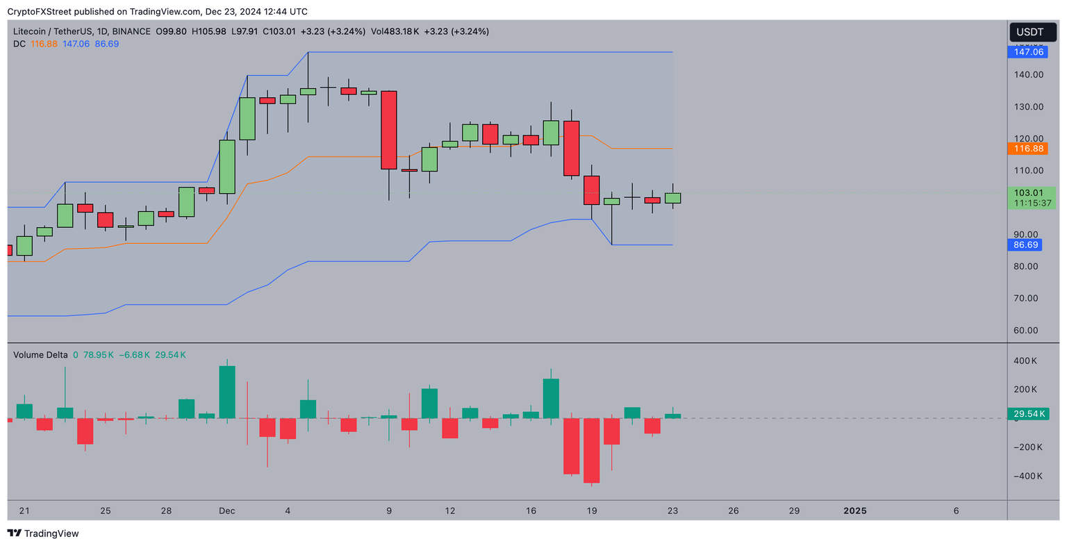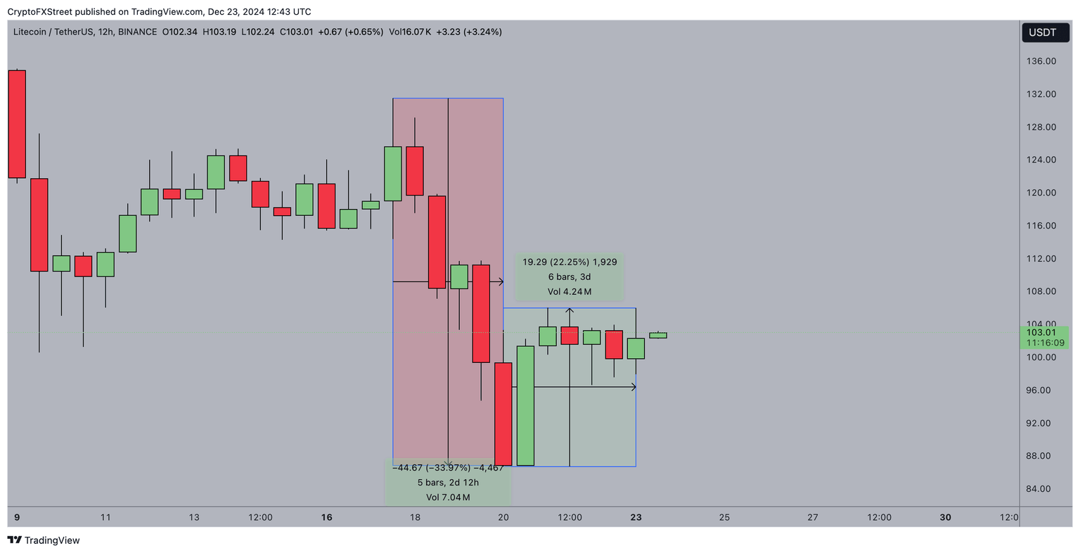 - Litecoin price briefly touched the $105 mark on Monday, rebounding 22% from the one-month low of $87 recorded during the market crash on December 20.