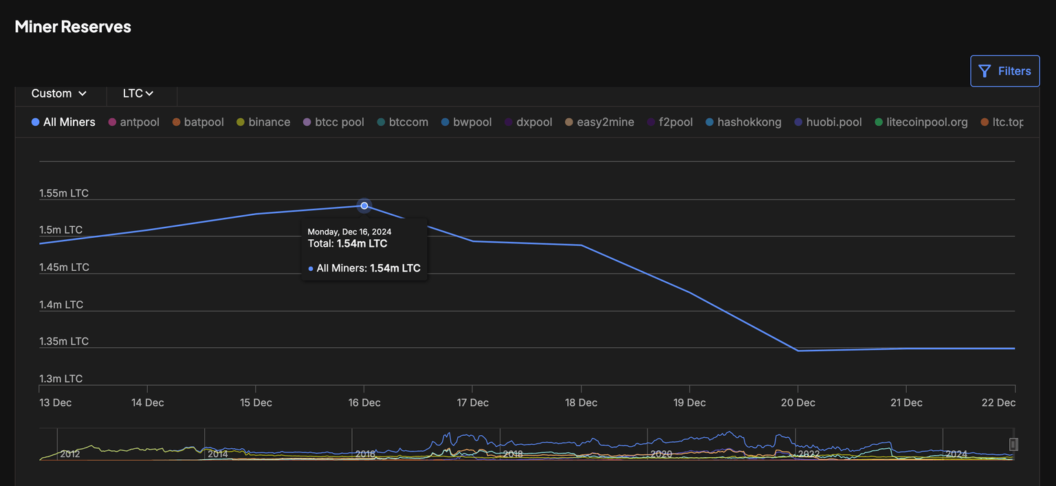 Between December 16 and December 20, Litecoin miners sold off a significant 210,000 LTC, reducing their reserve balances from 1.54 million to 1.35 million LTC.