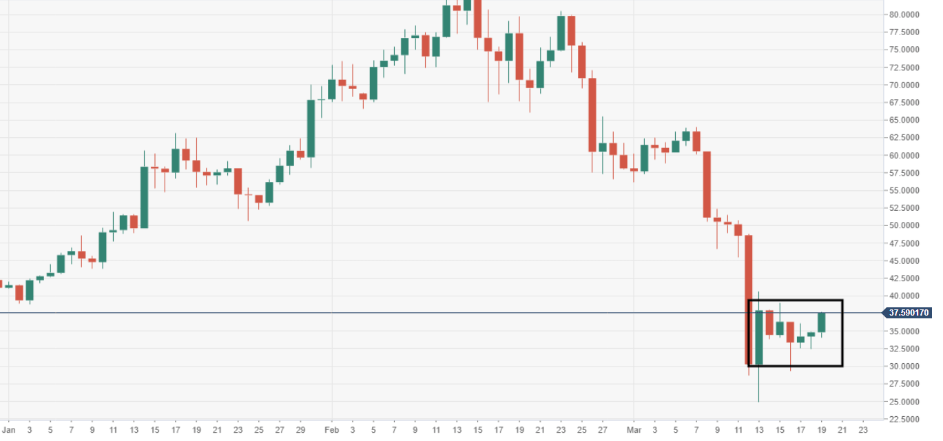 Price action is narrowing within a range-block, the low support down at $32.50, resistance to the upside notable at $35.00.