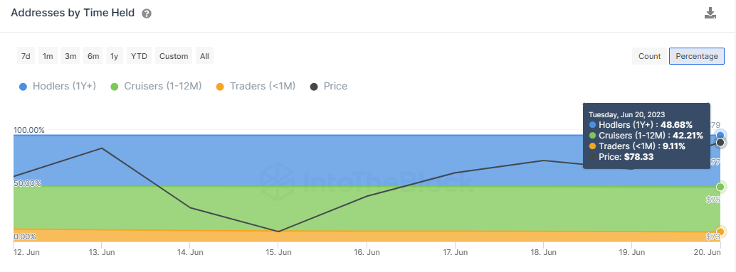 Data from IntoTheBlock, specifically the ‘Addresses by Time Held’ metric, shows that long-term hodlers and cruisers are the ones responsible for Litecoin’s sustained uptrend. Between June 12 and June 22, the percentage of long-term investor addresses, composed of hodlers and cruisers, increased from 48.14% to 48.68% and 41.93% to 42.21%, respectively. Notably, this cohort of addresses has retained their coins for more than 1 year.