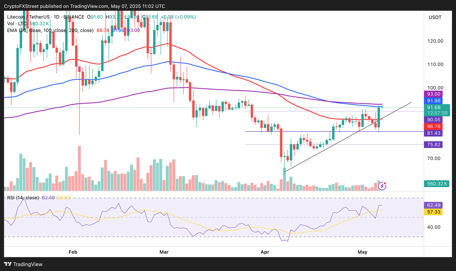 Litecoin (LTC) price gains bullish momentum, extending the previous day’s positive move to trade at $92 at the time of writing on Wednesday, as markets gauge the potential impact of the Federal Reserve’s (Fed) interest rates decision during the American session. Although the central bank is expected to leave the rates unchanged at the 4.25%-4.5% range, the Fed Chair Jerome Powell’s comments would expand on the policy amid thawing trade tensions. Planned trade talks between the United States (US) and China could give insight into the market’s direction later this week.