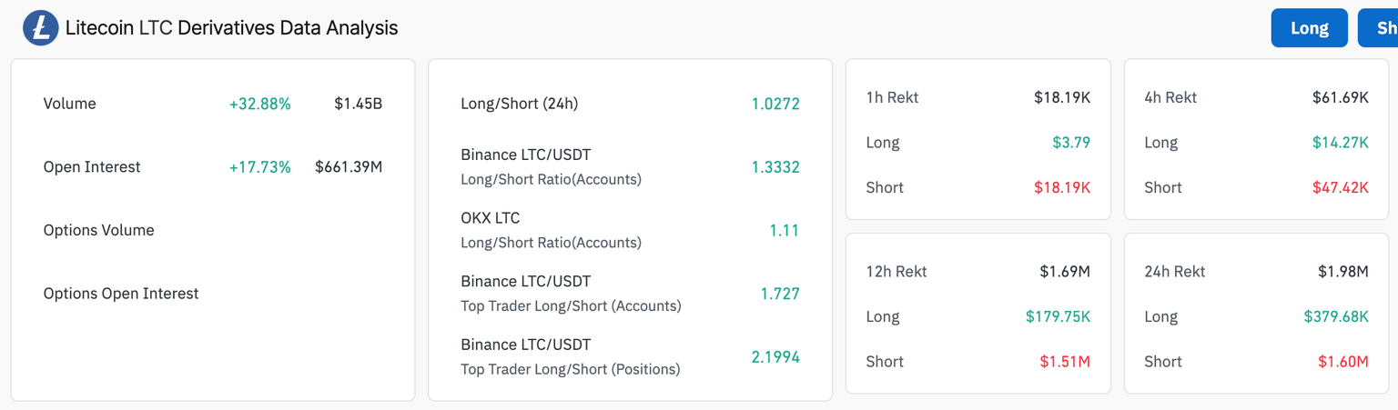A 17.73% surge in Open Interest (OI) reveals a significant influx of new positions in the Litecoin derivatives market. The uptick reflects growing trader interest, as OI measures the total number of outstanding contracts. It is plausible that traders are positioning for a run-up above $100 as Litecoin’s price gains bullish momentum.