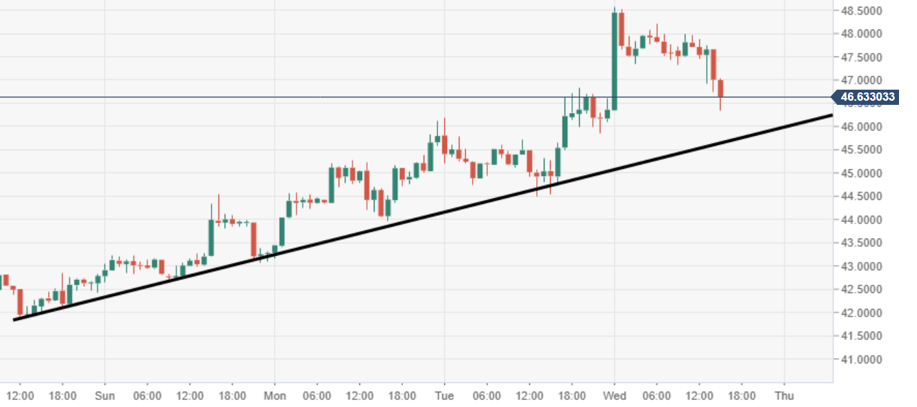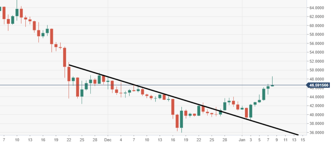 - Next major area of interest is likely to be the psychological $50 price mark for the bulls.