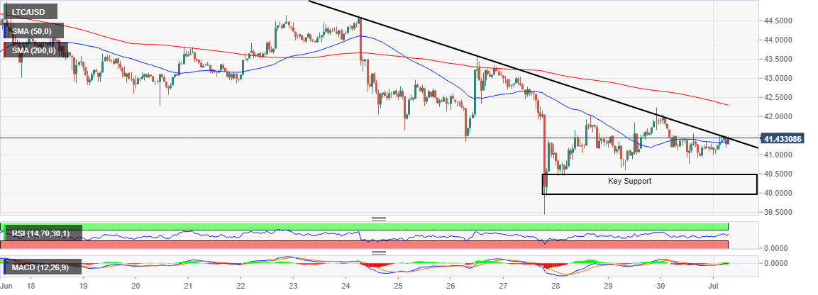 - Litecoin extends the bullish leg towards $42.00 resistance but a descending trendline stands in the way.