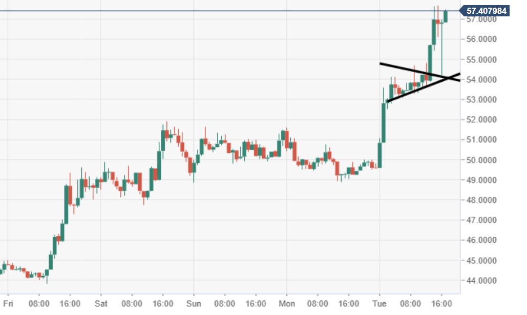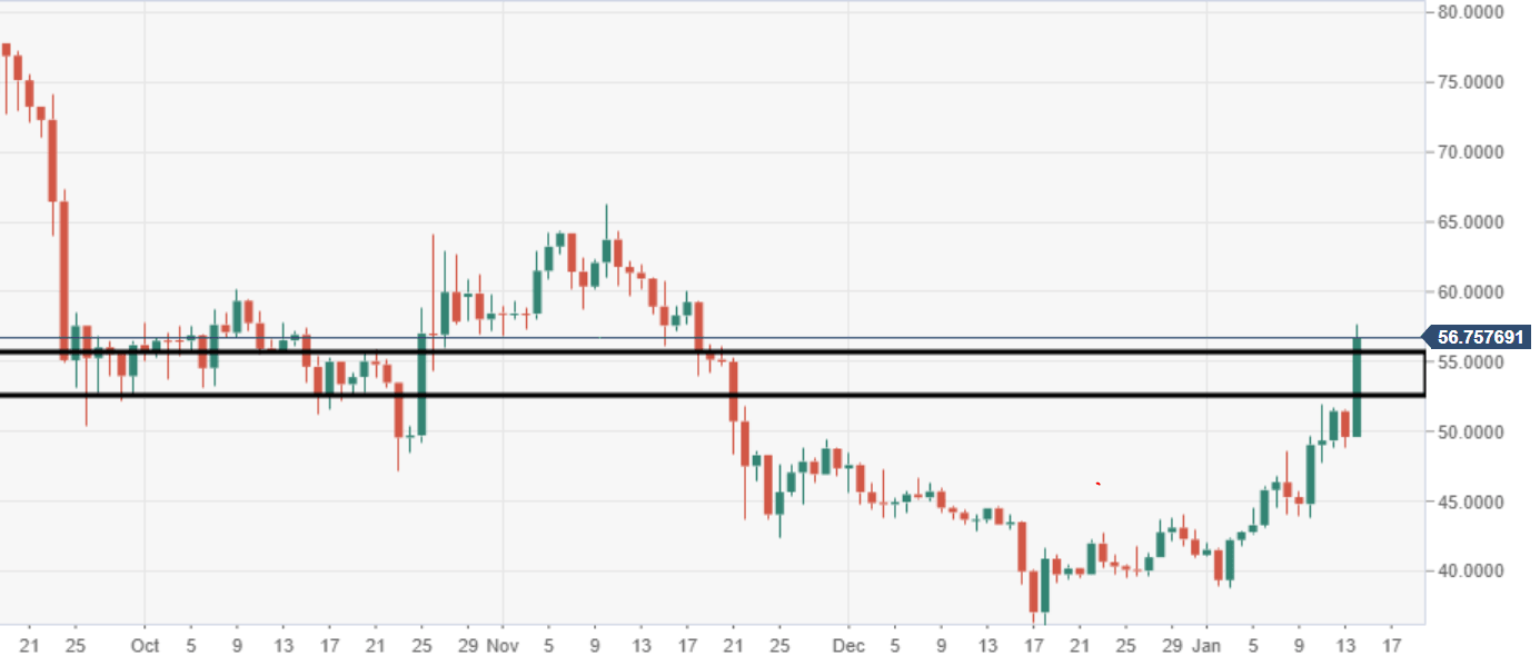 The bulls will be attempting to break down supply at the $55 price mark, should a breach be observed then further buying would be eyed.