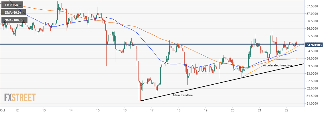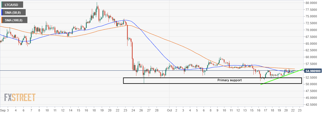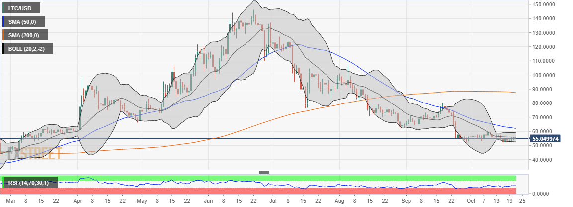 - Litecoin bulls must pull above the lock-step trading under $55 to gain momentum towards $60.