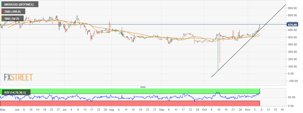 Following a recent flash drop to lows around $44, MKR has been trading a higher high pattern. The struggle to overcome the resistance at $600 finally gave way for the ongoing majestic recovery. MKR is testing the nest hurdle at $700 and if broken, the momentum could propel it to the next supply zone at $700. In the meantime, the Relative Strength Index shows Maker having a bullish bias.