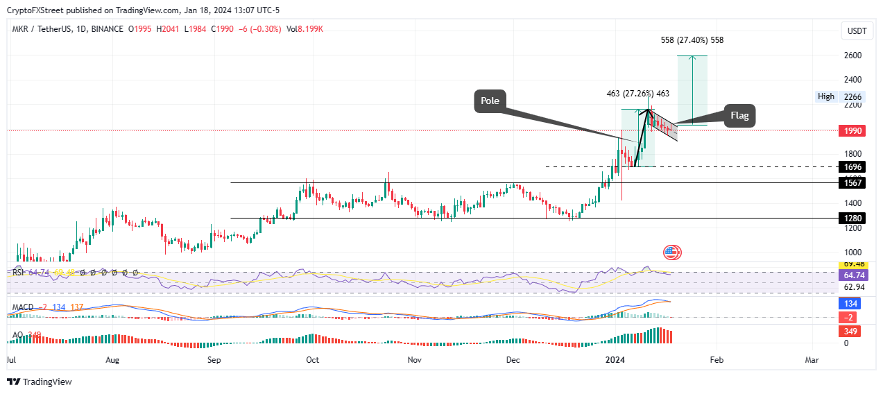 If the bullish flag pattern is activated, Maker price could clear the range high at $2,266 before extending the climb 27% to $2,600, levels last tested in December 2021.