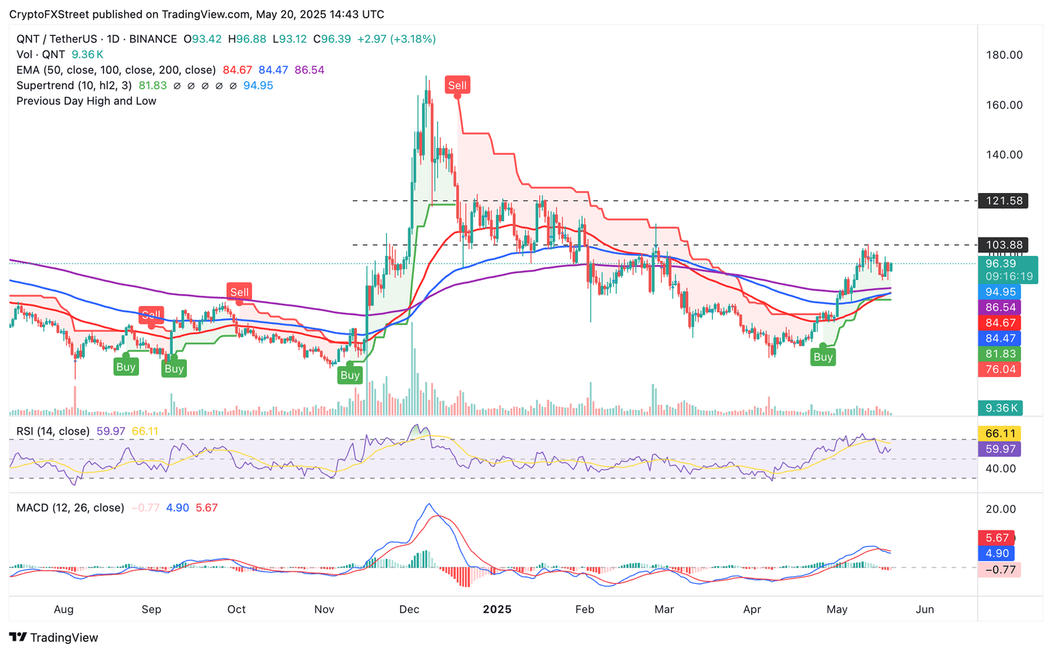 On the other hand, Quant’s interoperability solutions position it as a vital infrastructure provider for cross-chain RWA applications. Trading at around $96 at the time of writing, QNT shows signs of a strong tailwind and a high probability of closing day above the $100 mark.
