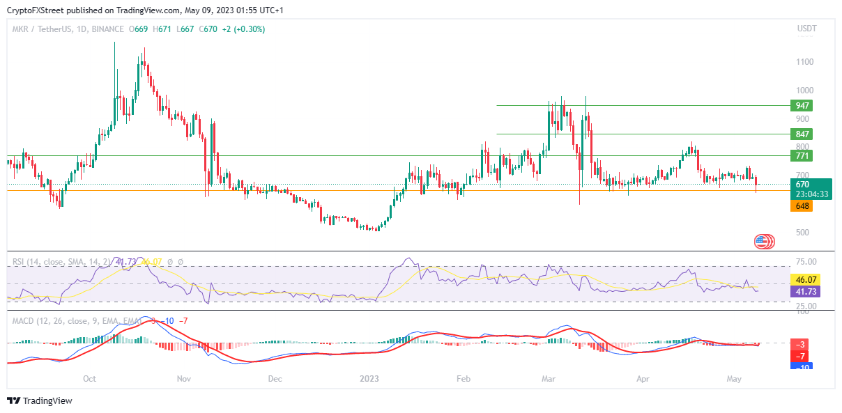 Conversely, if bullish momentum fails to overpower the bearish force, Maker price could drop under the immediate support at $648, exposing MKR to further loses. In this instance, the altcoin could revist the support floor around the psychological $500 level in the dire case.