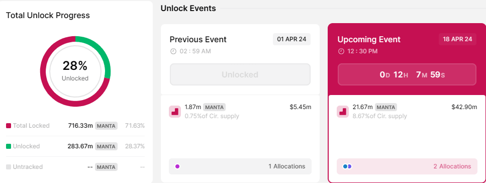 Data according to token unlocks app indicates that the Manta Network has a massive token unlocks event lined up for Thursday, April 18, where up to 21.67 million MANTA tokens will be unleashed to the market.
