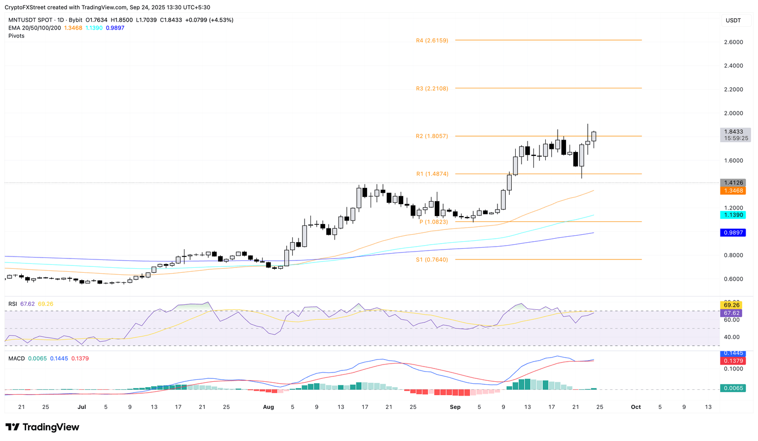 Mantle (MNT) price advances higher for the third straight day, trading above $1.80 at press time on Wednesday. The announcement of the VIP holder program and trading fees discount over Bybit on Tuesday boosted the interest in MNT derivatives. Furthermore, the technical outlook suggests an extended rally, potentially reaching a new record high.