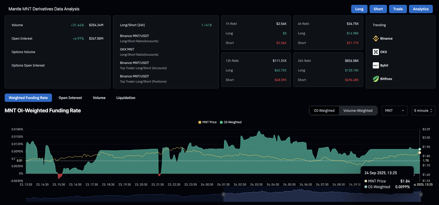 Following the new integrations, the CoinGlass data indicate that the MNT Open Interest (OI) has increased by 4.97% over the last 24 hours, now standing at $267.00 million. This significant capital increase locked in MNT derivatives points to risk-on sentiment among traders.