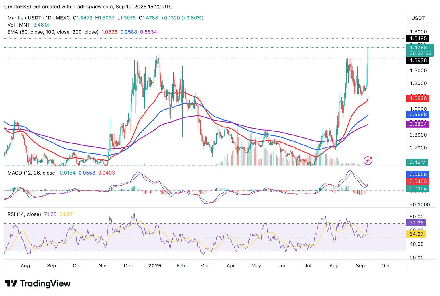 Mantle holds significantly above the 50-day Exponential Moving Average (EMA) at $1.08, the 100-day EMA at $0.95 and the 200-day EMA at $0.88, backing positive sentiment in the ecosystem.