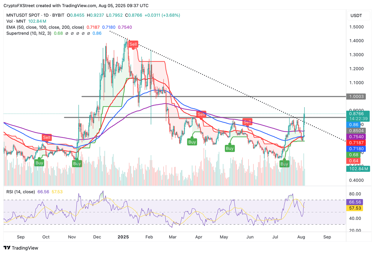 Mantle (MNT) price extends gains on Tuesday, trading at around $0.87 at the time of writing after Monday's almost 20% surge. The token known for bridging Traditional Finance (TradFi) and Decentralized Finance (DeFi) by ensuring security and scalability is experiencing an influx of capital underpinned by institutional and retail interest.