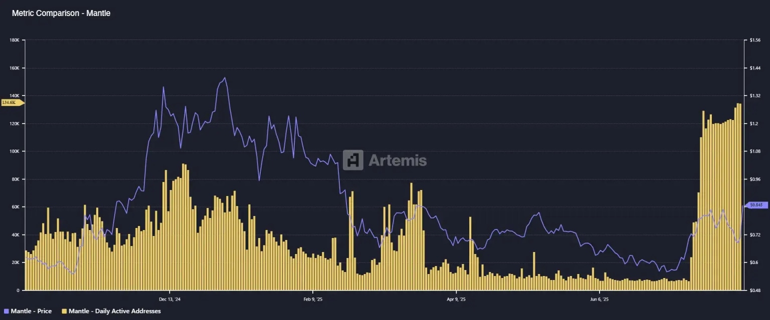 Active Addresses on the Mantle Network have also experienced a major boost, growing by more than 1,600%, from 7,000 to around 120,000 in less than a month, according to Artemis Analytics. This surge aligns with the positive reaction in the price of MNT, which is up approximately 28% in August.