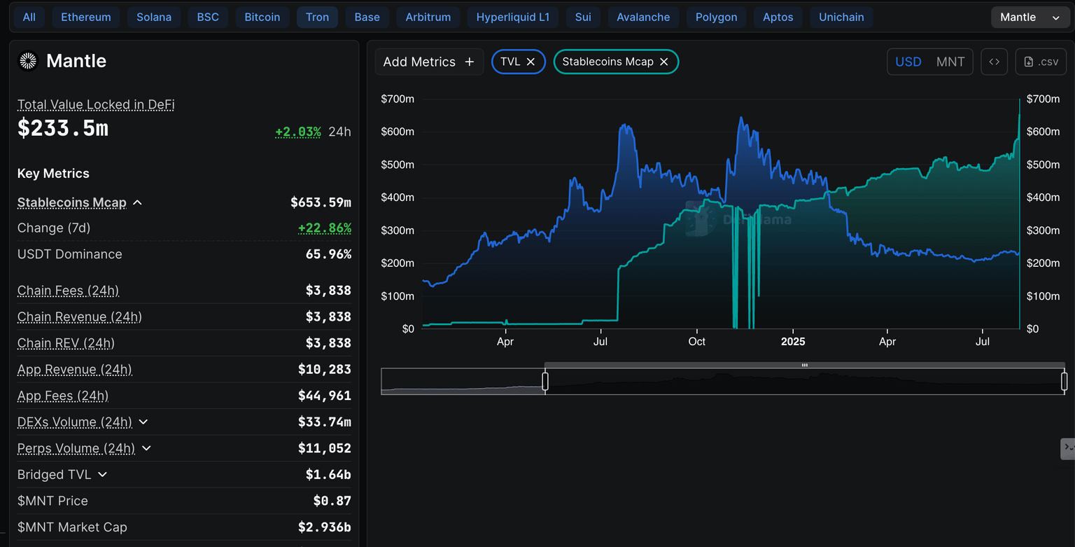 - Stablecoin market capitalisation on the Mantle network surges 23% in 24 hours, reaching $654 million.