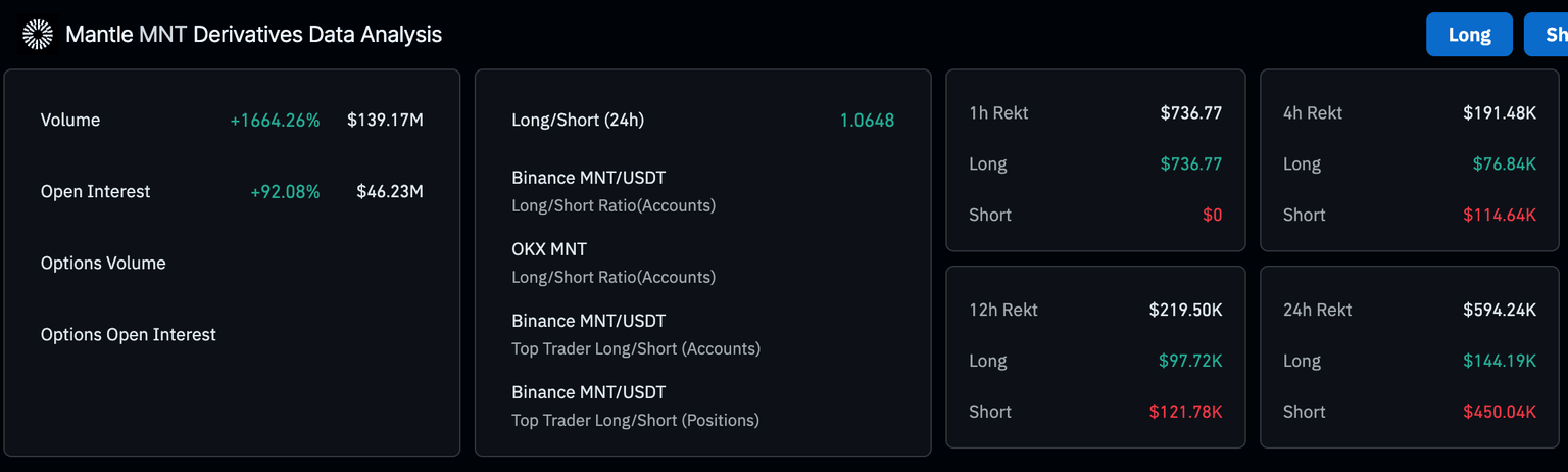 The derivatives market sheds light on a significant 92% increase in Open Interest (OI) to $46 million over the last 24 hours. Moreover, volume grew more than 16 times to $139 million in the same time frame, underscoring the spike in trading activity. A long-to-short ratio of 1.0648 indicates that traders are increasingly betting on the MNT price rising in the short term.