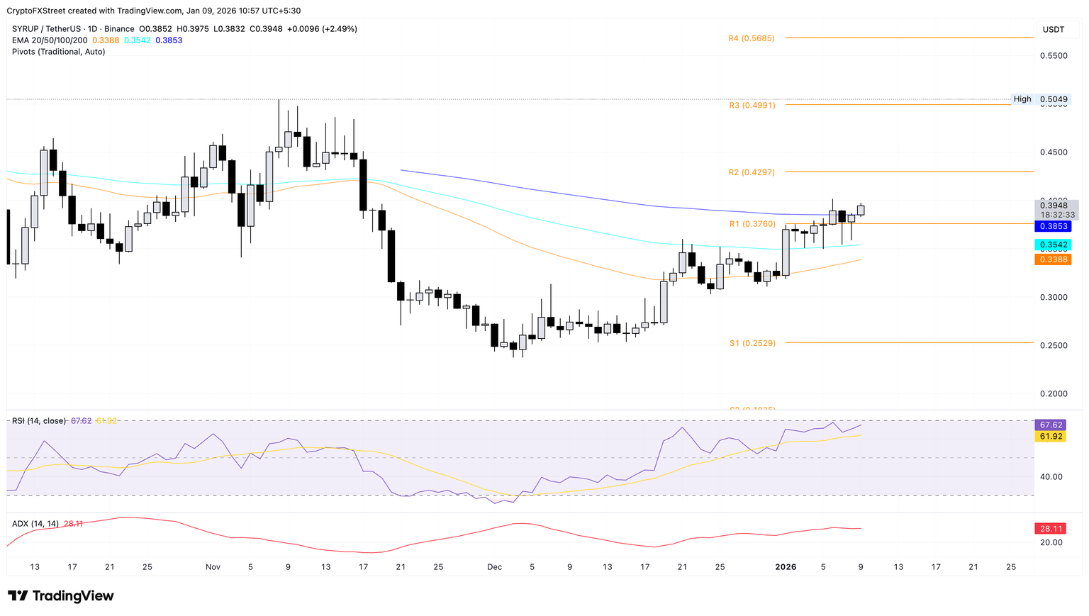 Looking down, if SYRUP dips below the R1 Pivot Point at $0.3760, which is roughly close to the 200-day EMA at $0.3853, the 100-day and 50-day EMAs at $0.3542 and $0.3388 could serve as support levels.
