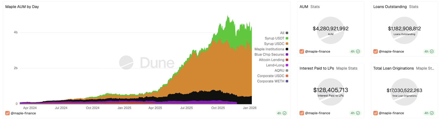 - Maple Finance hit a record-high revenue of $2.49 million in December, while AUM remains above $4.28 billion.