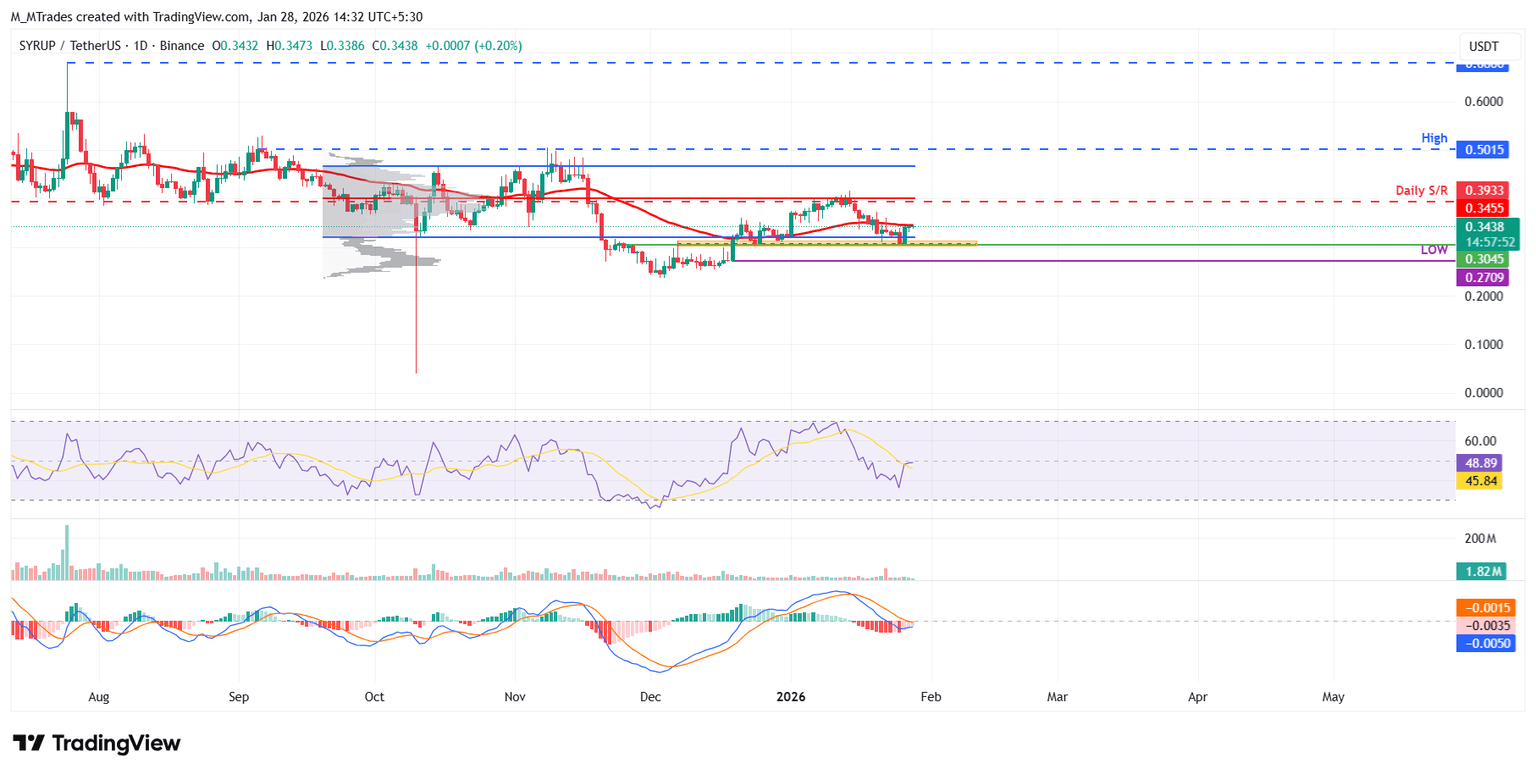 On the other hand, if SYRUP closes below $0.30, it could extend the correction to the December 19 low at $0.27.