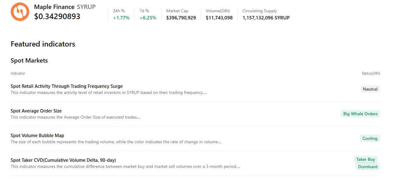 CryptoQuant’s summary data supports the bullish outlook, as SYRUP’s spot markets show large whale orders, cooling conditions, and buy dominance. All these factors suggest that Maple Finance may be positioning for a breakout in the coming days.