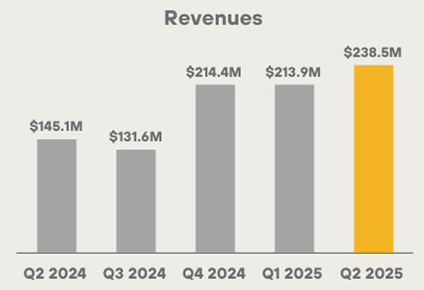 MARA Holdings’ revenues increased 64% year-on-year to $238 million, up from $145 million in Q2 2024 and also gaining from its $214 million revenues in the first quarter of 2025, the company said on Tuesday.