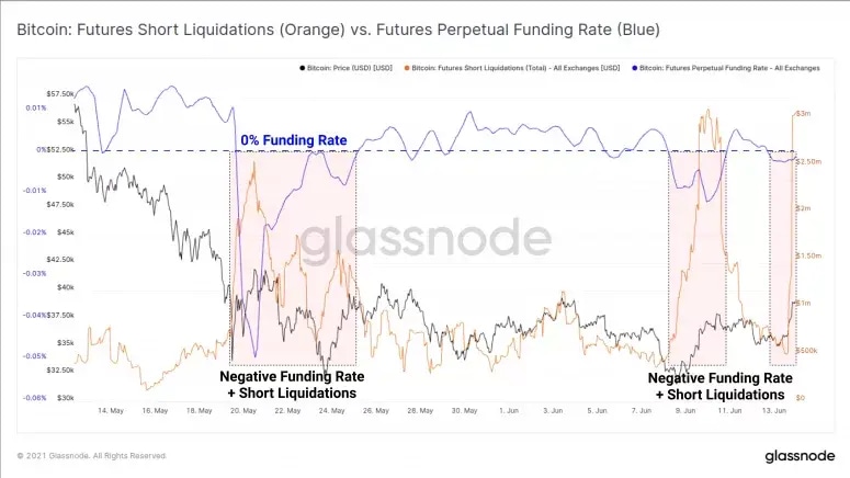 Meanwhile, research by Glassnode shows that short liquidations in bitcoin futures occur when the perpetual funding rate turns negative, during the consolidation for the past month.