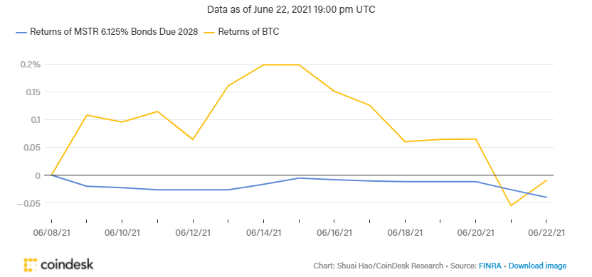 Prices on the $500 million bond, which closed on June 15, dropped almost three points after the company said on Monday it completed its purchase of 13,005 bitcoin at an average price of $37,617. Bitcoin was trading at around $32,542 as of press time.