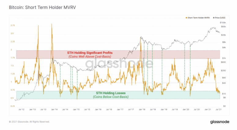 Short-term holders who are underwater (holding bitcoin significantly below the acquisition cost) are in capitulation mode, according to data from Glassnode.