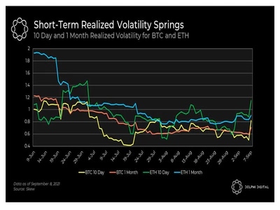 “Realized volatility is now on the rise and it’s very possible the market goes through a period of ranged price action,” crypto research firm Delphi Digital tweeted on Thursday. The chart below shows the increase in 10-day and one-month realized volatility for BTC and ETH during the crypto sell-off earlier this week.