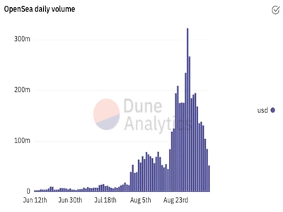 However, there are signs the NFT boom may be slowing in September. WuBlockchain tweeted, “OpenSea’s daily trading volume is showing a downward trend. The single-day trading volume on September 8 was below 100 million for the first time since August 21. Compared with the peak trading volume on August 29, it has dropped by about 3/4.”