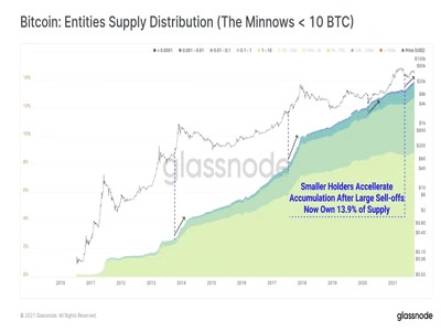 Small bitcoin holders, or those who own fewer than 10 BTC, have accelerated their accumulation of BTC after large sell-offs, according to blockchain data compiled by Glassnode.