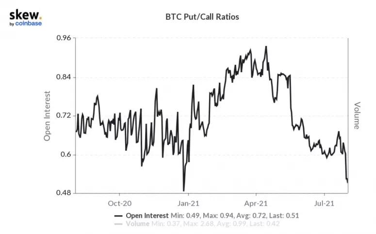 The chart below shows the bitcoin put/call ratio at the lowest level since January, which preceded a brief 25% pullback in the bitcoin spot price.