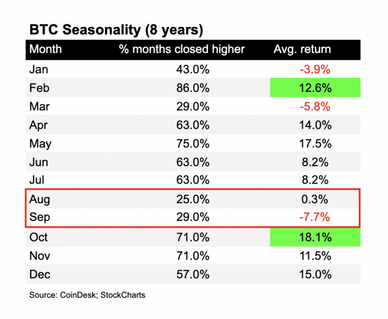 Similar to stocks, bitcoin is approaching a seasonally weak period, which could encourage buyers to take profits. The table below shows, on average, relatively weak returns in August over an eight-year period. September tends to be the worst month. Buying picks up in October and February.