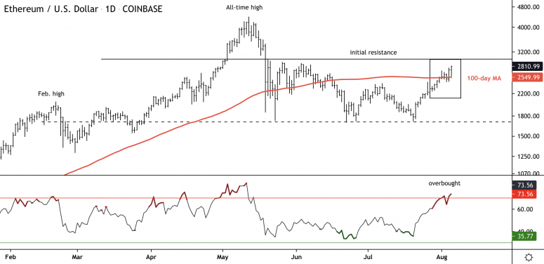 Ether is now above the 100-day moving average for the first time since June. The price rally has cleared a significant technical hurdle, although the price could find some resistance at the $3,000 level.