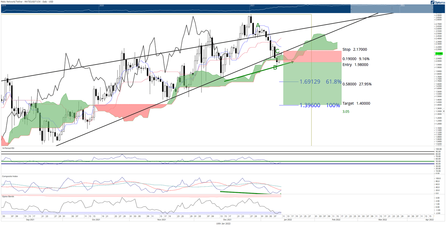 If resistance against the lower trend line holds and MATIC price begins to drop, there is a fantastic short opportunity. The hypothetical short setup is a sell stop order at $1.98, a stop loss at $2.17, and a profit target at $1.40. In addition, the daily close must be at or slightly below the $1.98 entry. If the short setup is triggered, it will fulfill all conditions required for an Ideal Bearish Ichimoku Breakout setup – an entry that portends a significant drop to new three-month lows.