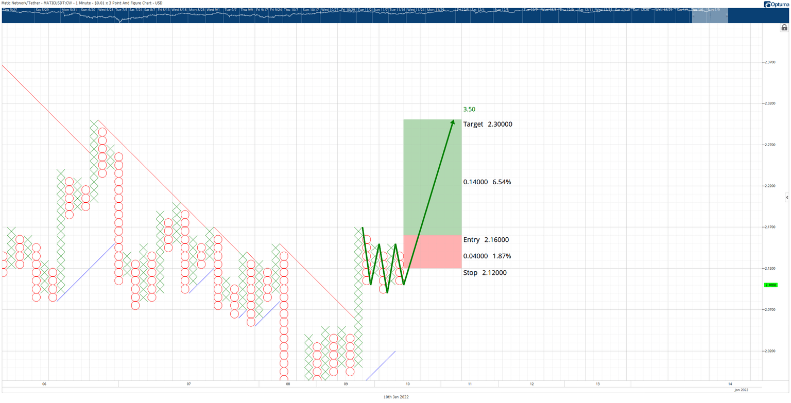 There is a theoretical long setup on the $0.01/3-box reversal Point and Figure chart for MATIC price. The long setup is a buy stop order at $2.16, a stop loss at $2.12, and a profit target at $2.30. The entry is based on the breakout above a triple-top and the neckline of an inverse head and shoulders pattern. The trade idea represents a 3.5:1 reward for the risk setup. The projected profit targets would put MATIC comfortably back inside the rising wedge pattern on the daily candlestick chart.