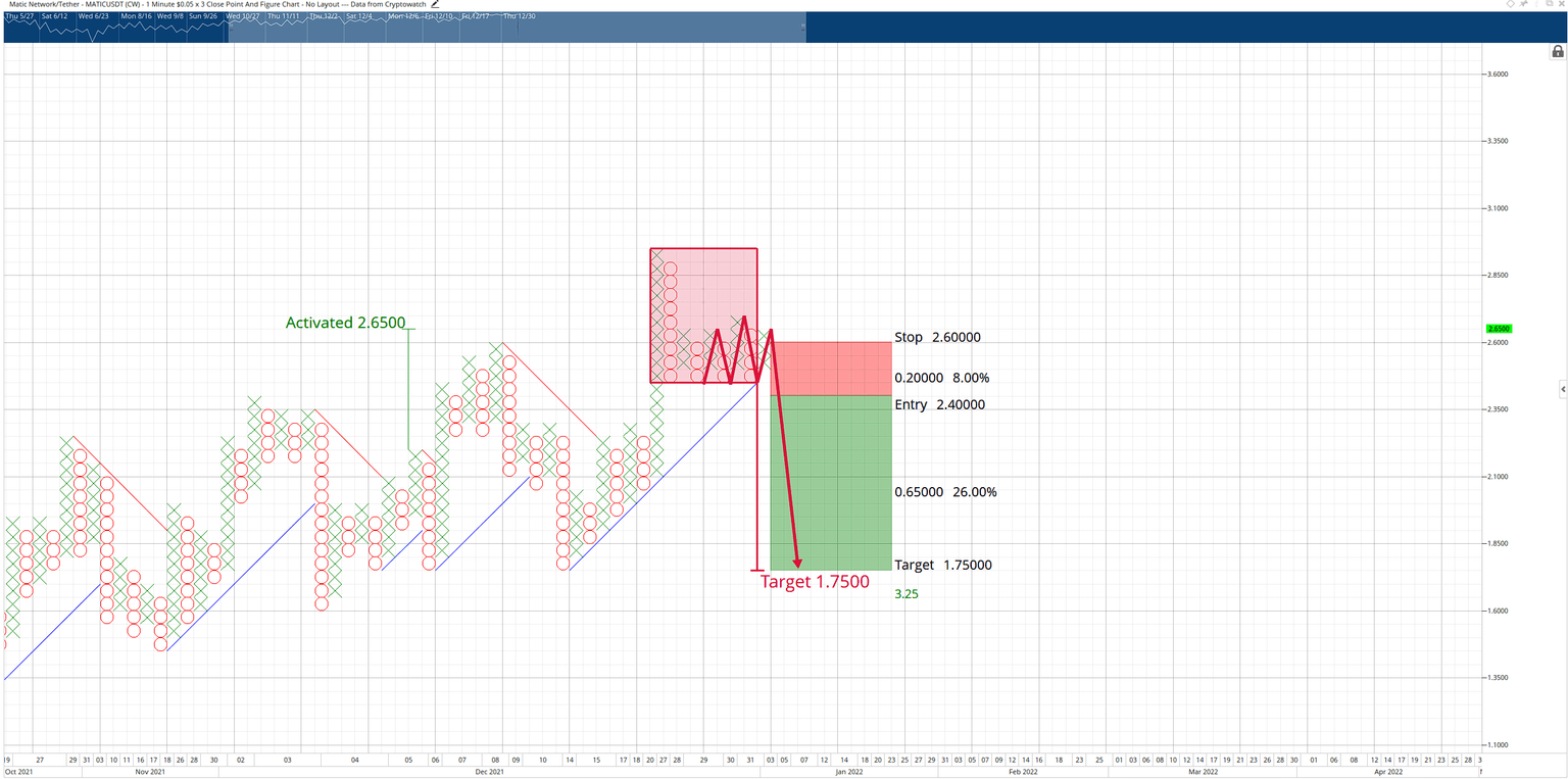 There is a head-and-shoulders pattern and a quintuple-bottom bearish breakout trade setup for MATIC price. The theoretical short setup is a sell stop order at $2.40, a stop loss at $2.60, and a profit target at $1.75. This trade idea represents a 3.25:1 reward for the risk with an implied profit of 26% from the entry. A two-box trailing stop would help protect any profit generated post entry.