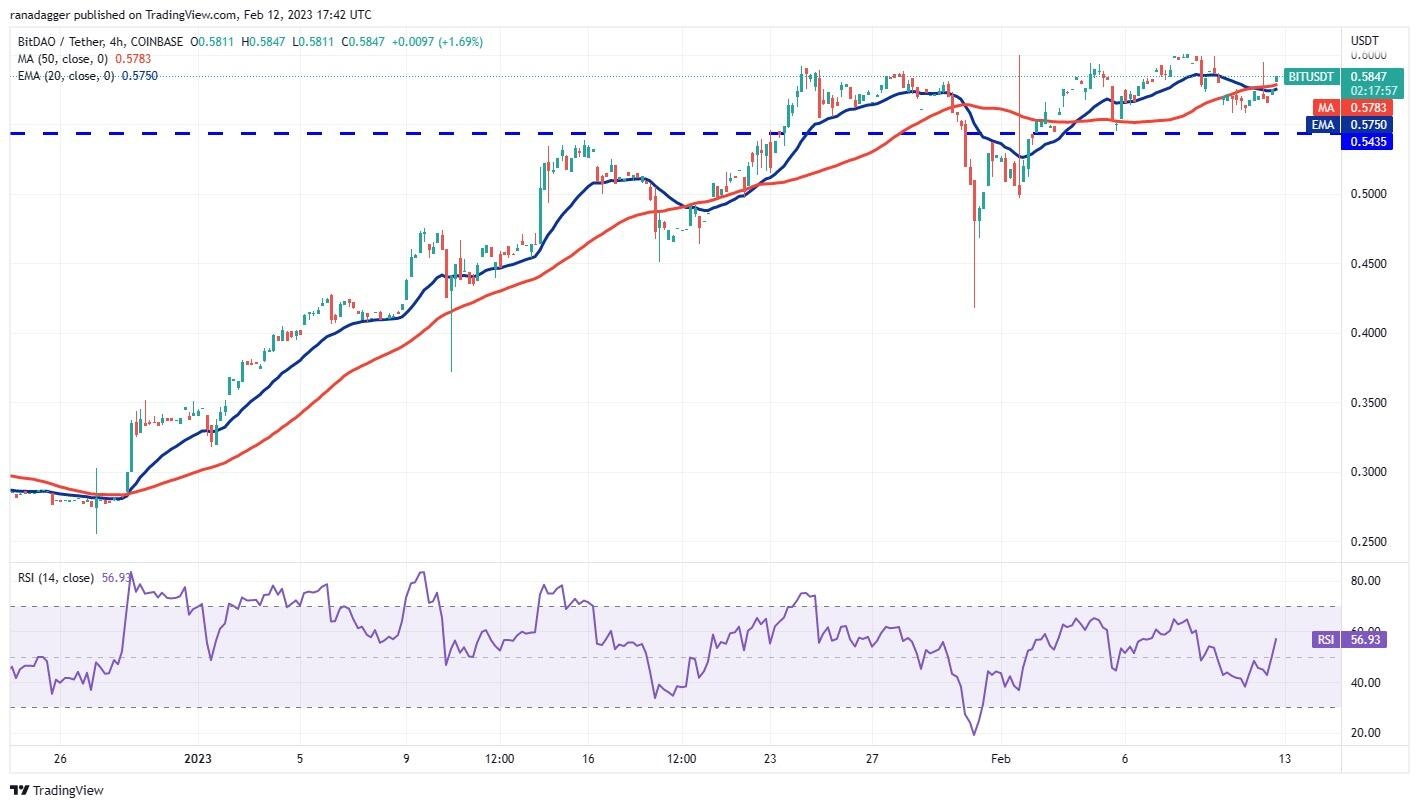The BIT/DAO pair is not out of danger yet because the long wick on the Feb. 11 candlestick shows that bears are selling on rallies near $0.60. The bears will again try to sink and sustain the price below the 20-day EMA. If they can pull it off, the pair could extend its pullback to the 50-day SMA ($0.48).